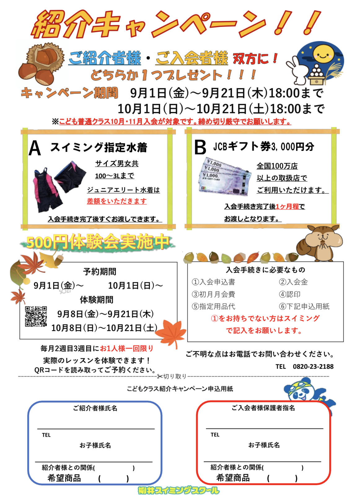 2023/09/01 9月1日(金)~10月21日(土)の期間で 紹介キャンペーンを行います? 9月21日までに申込み→10月スタート 10月21日までに申込み→11月スタート となっております✨ 水着またはJCBギフト券3000円分 どちらかを双方にプレゼント? 用紙は受付に準備しております。 ご不明な点がありましたら、受付まで問い合わせ下さい。 お得な機会に是非ご入会下さい。お待ちしております✨